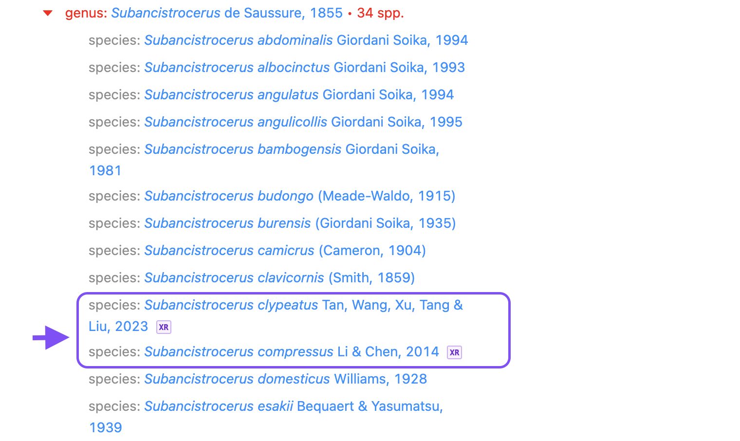 - Browse view: Shows the COL eXtended Release merged names marked with the XR icon. Thus you can identify which names come from vetted sources and which from the additional sources (regional, national, and management checklists among others).